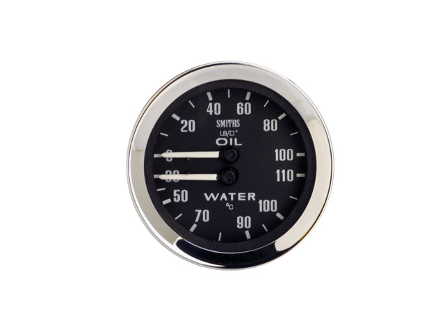 英国製"SMITHS"ロゴ、油圧 & 水温計、52mm 径、機械式 (2mブルドン管)、ブラックスケール